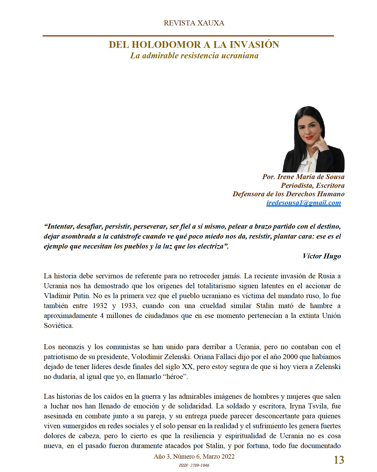 Abstract: History must serve as a reference to never go back. Russia’s recent invasion of Ukraine has shown us that the origins of totalitarianism are still latent in the actions of Vladimir Putin. It is not the first time that the Ukrainian people have been victims of the Russian mandate, it was also between 1932 and 1933, when with similar cruelty Stalin starved approximately 4 million citizens who at that time belonged to the former Soviet Union.