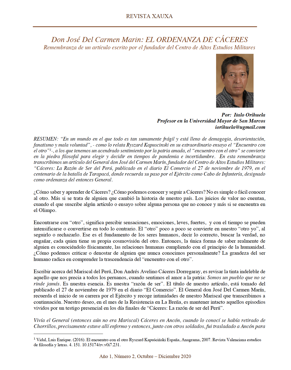 Resumen: “En un mundo en el que todo es tan sumamente frágil y está lleno de demagogia, desorientación, fanatismo y mala voluntad”, – como lo relata Ryszard Kapuscinski en su extraordinario ensayo el “Encuentro con el otro” 1-, a los que tenemos un acendrado sentimiento por la patria amada, el “encuentro con el otro” se convierte en la piedra filosofal para elegir y decidir en tiempos de pandemia e incertidumbre. En esta remembranza transcribimos un artículo del General don José del Carmen Marín, fundador del Centro de Altos Estudios Militares: “Cáceres: La Razón de Ser del Perú, publicado en el diario El Comercio el 27 de noviembre de 1979, en el centenario de la batalla de Tarapacá, donde recuerda su paso por el Ejército como Cabo de Infantería, designado como ordenanza del entonces General.
