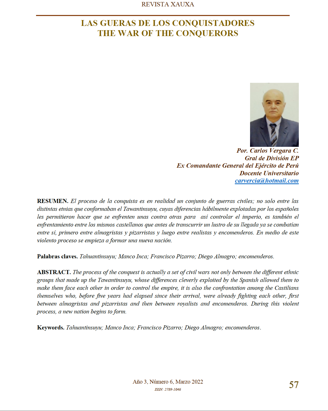 Abstract: The process of the conquest is actually a set of civil wars not only between the different ethnic groups that made up the Tawantinsuyu, whose differences cleverly exploited by the Spanish allowed them to make them face each other in order to control the empire, it is also the confrontation among the Castilians themselves who, before five years had elapsed since their arrival, were already fighting each other, first between almagristas and pizarristas and then between royalists and encomenderos. During this violent process, a new nation begins to form.