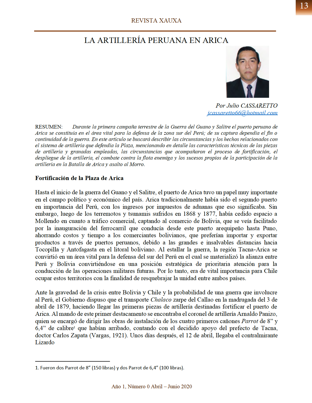 Abstract: During the first land campaign of the Guano and Saltpeter War, the Peruvian port of Arica became the vital area for the defense of the southern zone of Peru; on his capture depended the end or continuity of the war. This article will seek to describe the circumstances and facts related to the artillery system that defended the Plaza, mentioning in detail the technical characteristics of the artillery pieces and grenades used, the circumstances that accompanied the fortification process, the deployment of the artillery, the combat against the enemy fleet and the events of the artillery’s participation in the Battle of Arica and the assault on Morro.