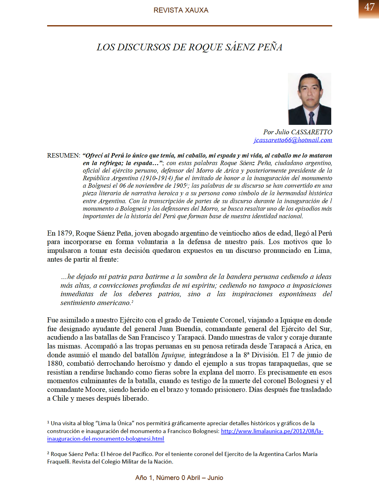 Abstract: “I offered Peru the only thing I had, my horse, my sword and my life, the horse was killed in the fray; the sword…“; with these words Roque Sáenz Peña, Argentine citizen, Peruvian army officer, defender of Morro de Arica and later president of the Argentine Republic (1910-1914) was the guest of honor at the inauguration of the Bolgnesi monument on November 6, 1951 ; the words of his speech have become a literary piece of heroic narrative and his person as a symbol of the historical brotherhood between Argentina. With the transcription of parts of his speech during the inauguration of the monument to Bolognesi and the defenders of Morro, it seeks to highlight one of the most important episodes in the history of Peru that form the basis of our national identity.