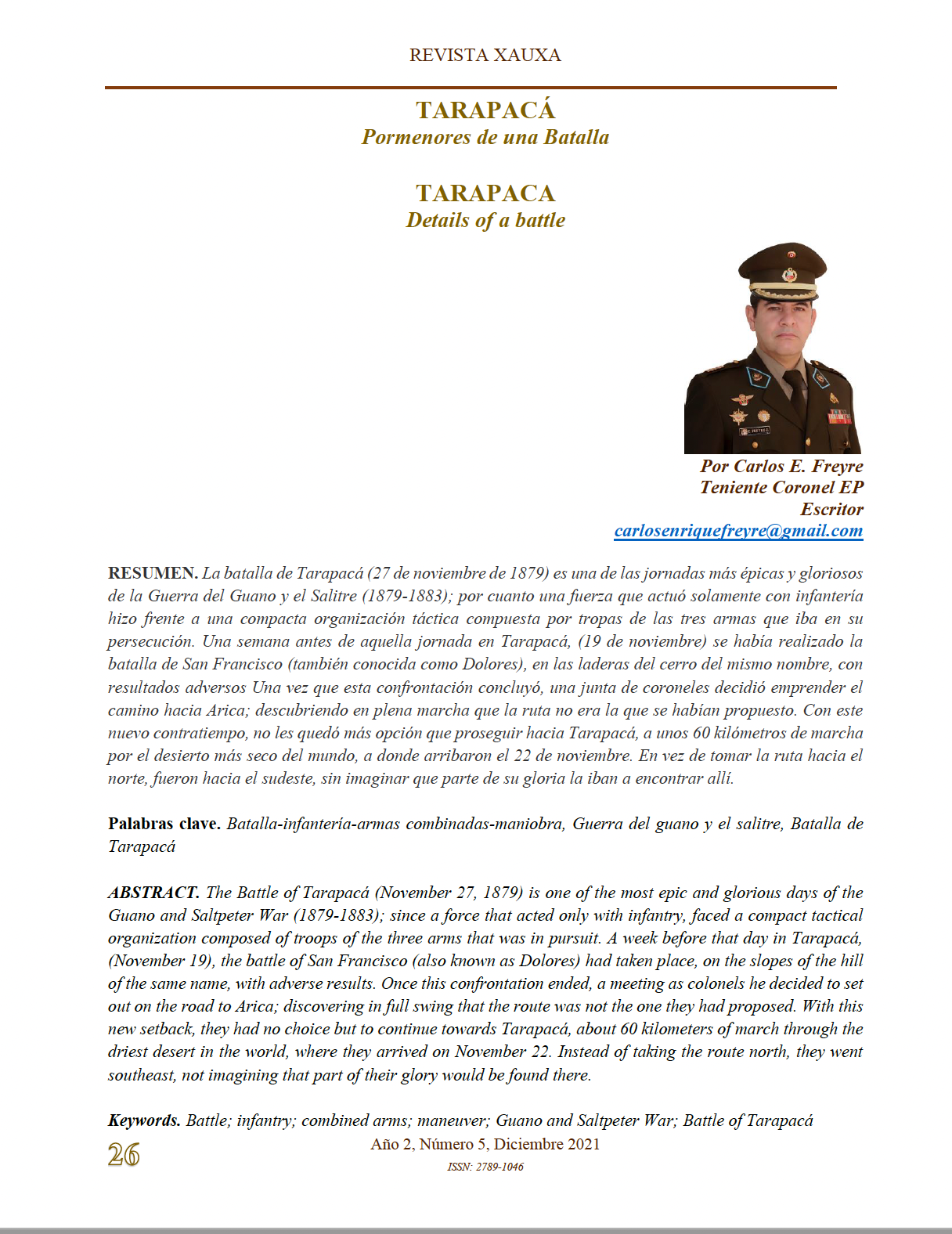 Abstract: The Battle of Tarapacá (November 27, 1879) is one of the most epic and glorious days of the Guano and Saltpeter War (1879-1883); since a force that acted only with infantry, faced a compact tactical organization composed of troops of the three arms that was in pursuit. A week before that day in Tarapacá, (November 19), the battle of San Francisco (also known as Dolores) had taken place, on the slopes of the hill of the same name, with adverse results. Once this confrontation ended, a meeting as colonels he decided to set out on the road to Arica; discovering in full swing that the route was not the one they had proposed. With this new setback, they had no choice but to continue towards Tarapacá, about 60 kilometers of march through the driest desert in the world, where they arrived on November 22. Instead of taking the route north, they went southeast, not imagining that part of their glory would be found there.
